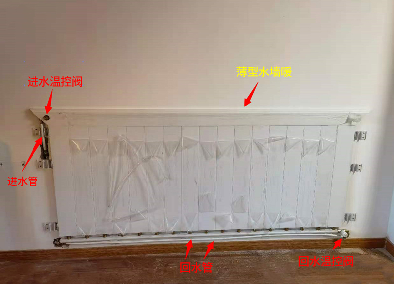 1.2、传统暖气片更换成银屋超薄暖气片安装好(改造的管道和温控阀体隐藏在侧边装饰罩里)