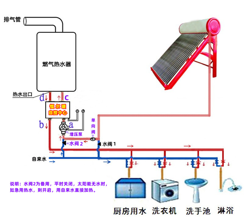 上图中,是在自控中心入水口加了增压泵的,非承压式太阳能热水器与燃气热水器之间的落差如果可以满足燃气热水器启动,可以不加增压泵;但加上增压泵,水压增大,使洗浴更舒适。