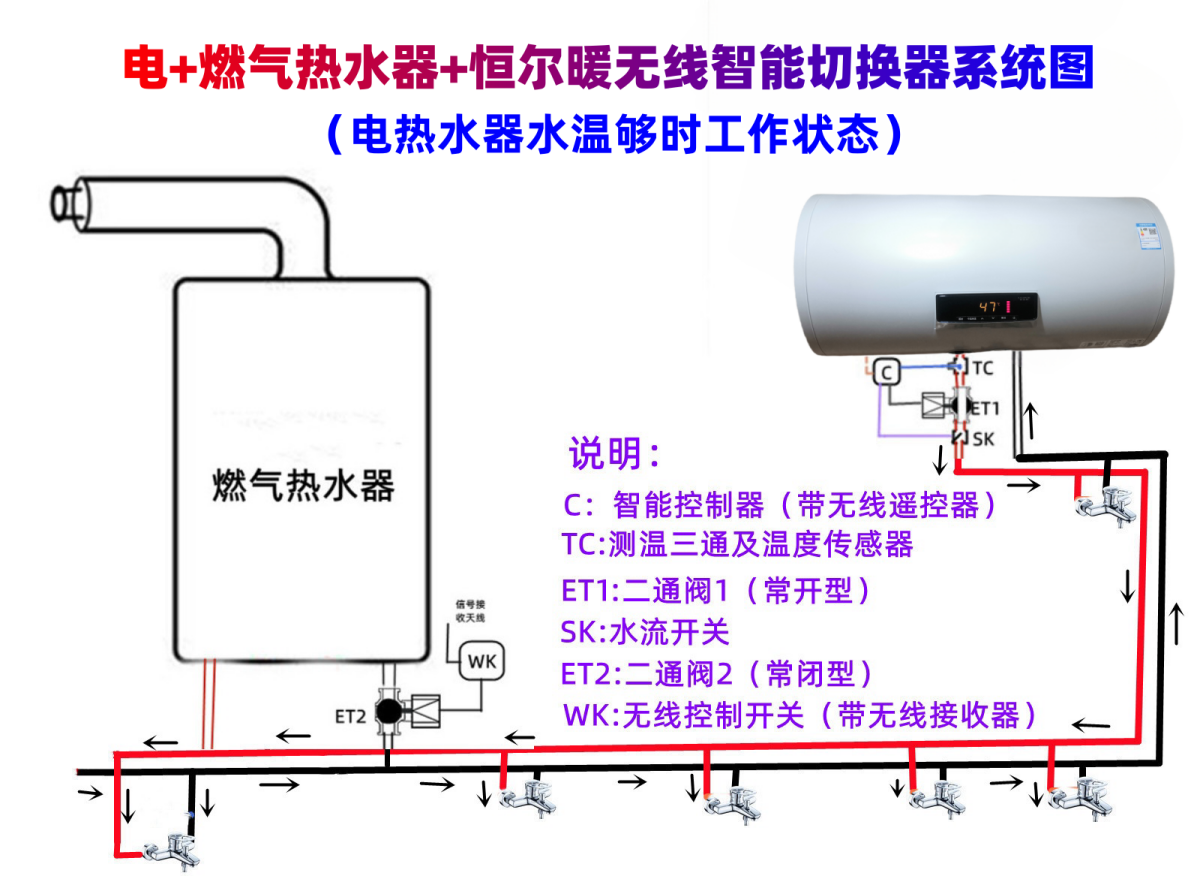 已装修房屋同时安装电热水器和燃气热水器,并且利用“恒尔暖无线智能控制器”自动切换,无法将系统做成一个循环回路,因此无法做成零冷水系统,做不到一开水龙头就有热水。