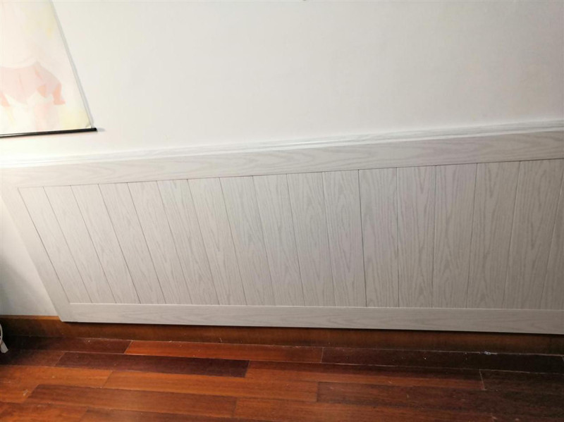 与之形成鲜明对比的是,护墙装饰板暖气片厚度仅为 3cm,背部紧紧贴合墙面安装,与墙面之间几乎没有缝隙,突出墙面的部分极少。每片散热片的侧边巧妙地插入另一片散热片侧边的 U 型槽里,紧密搭接在一起,从外观上看,就像是一整块完整的护墙板。它的上下装饰罩是一个整体,并且都没有开设对流孔。在安装时,上饰罩的上端口与墙面严丝合缝地接触,下饰罩与地面或踢脚线紧密相连,完全不留缝隙。从这些结构和安装特点可以看出,护墙装饰板暖气片和墙面之间没有形成对流的空间,散热片上下的装饰罩上没有对流孔,散热片内腔也无法形成对流。所以,它主要是通过向前的热辐射来供暖,向上的对流极少,不会产生烟囱效应,也就不会把灰尘吸附到墙面上。