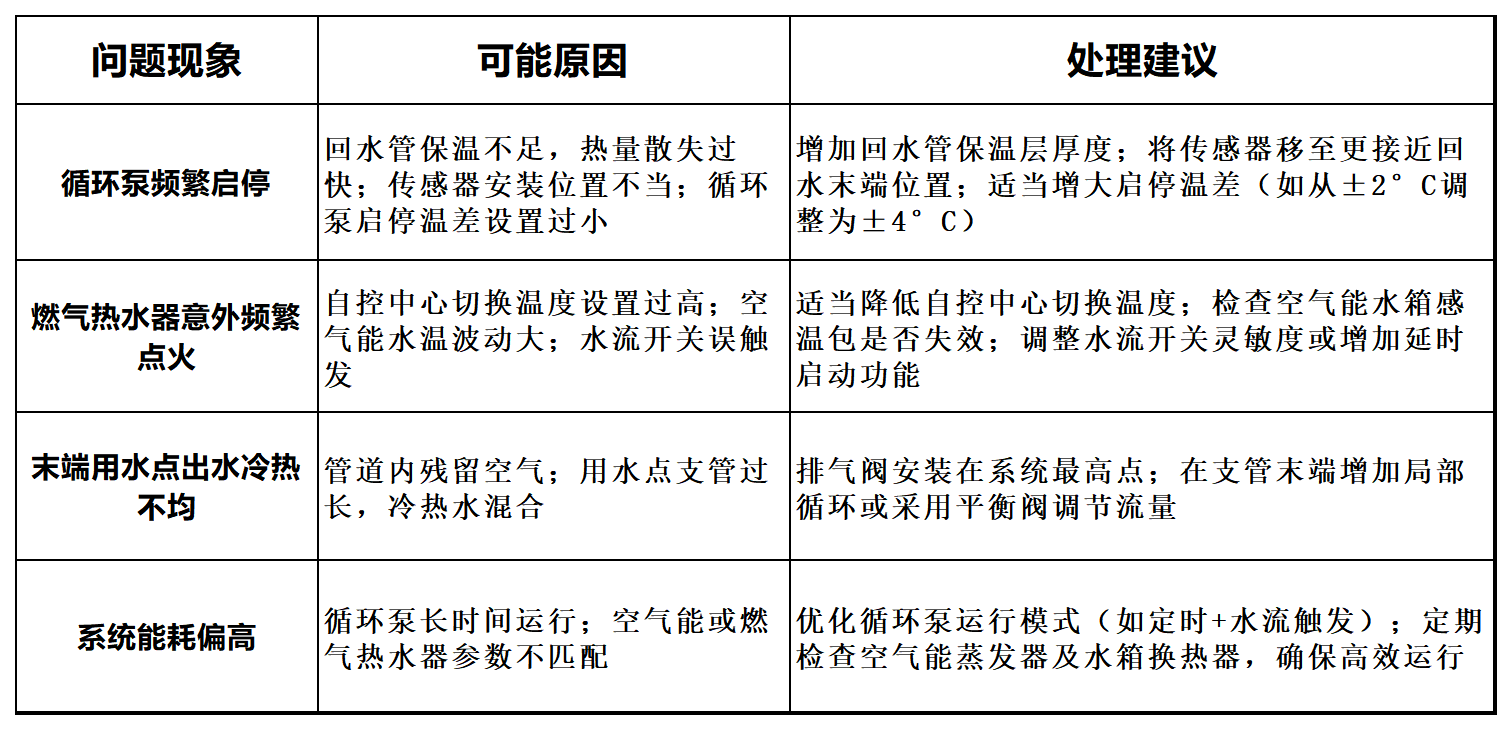 以空气能水箱作为循环中心的缺陷:如果空气能水箱内的水温很低,由于回水管处温度始终无法达到设置水温,循环泵会始终循环,不仅无法预热管道内的水,而且水箱内水温还会下降得很快。