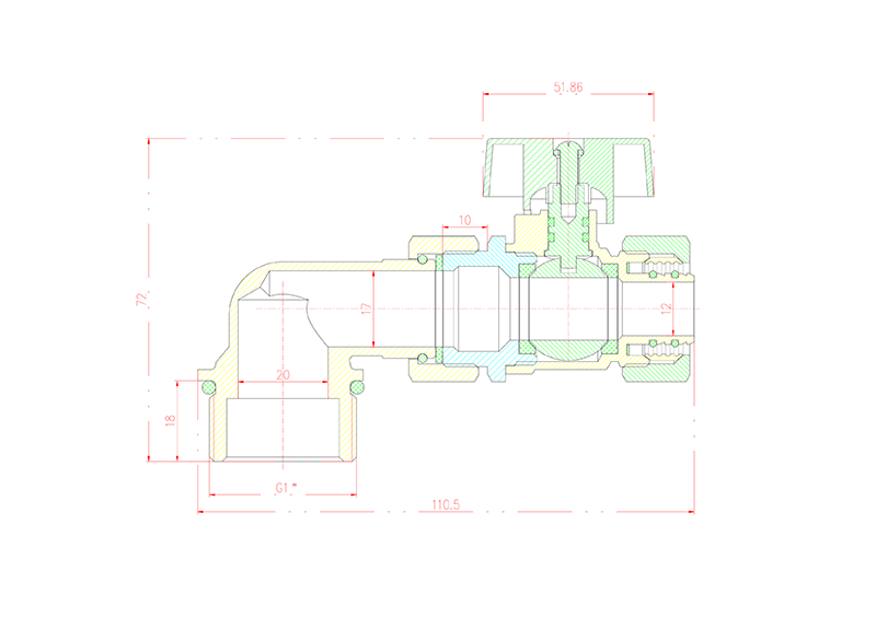 2、活接弯头+外丝球阀组装好后,总长度只有106mm,安装在供暖主管和分水器主管之间,不占空间,也方便以后维修;
