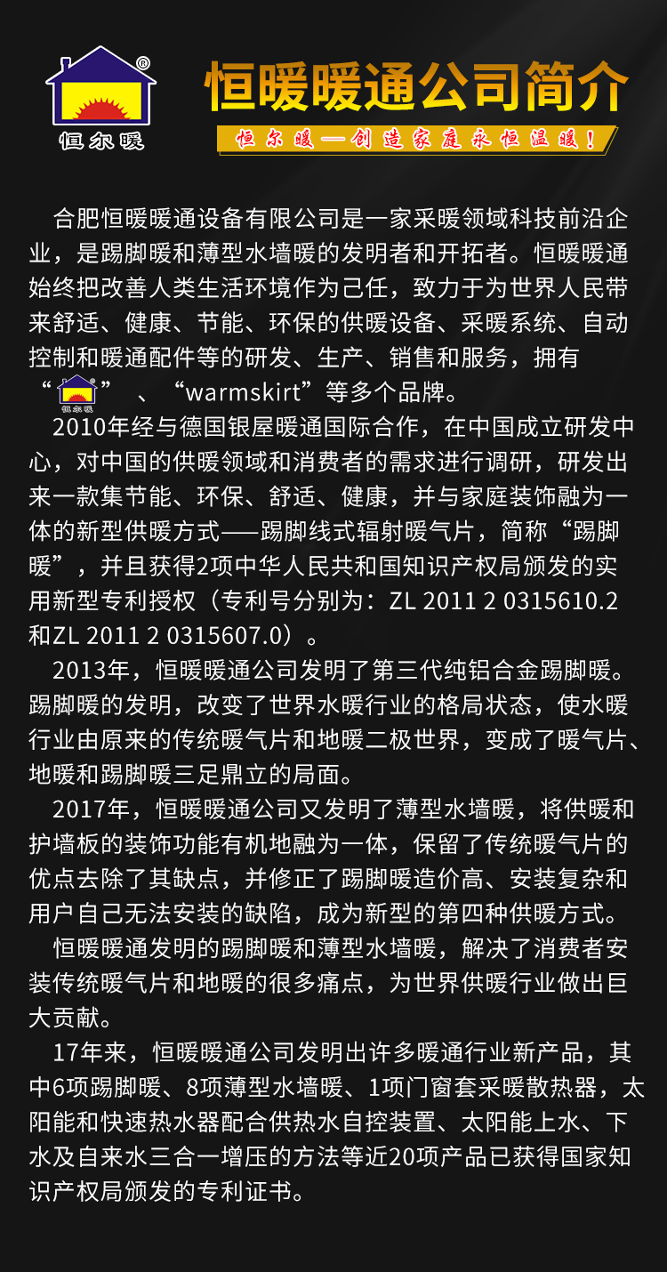 合肥恒暖暖通设备有限公司简介 合肥恒暖暖通设备有限公司,是一家采暖领域重要的企业之一,始终把改善人类生活环境作为己任,致力于为世界人民带来舒适、健康、节能、环保的踢脚暖、薄型墙围暖气...[更多]