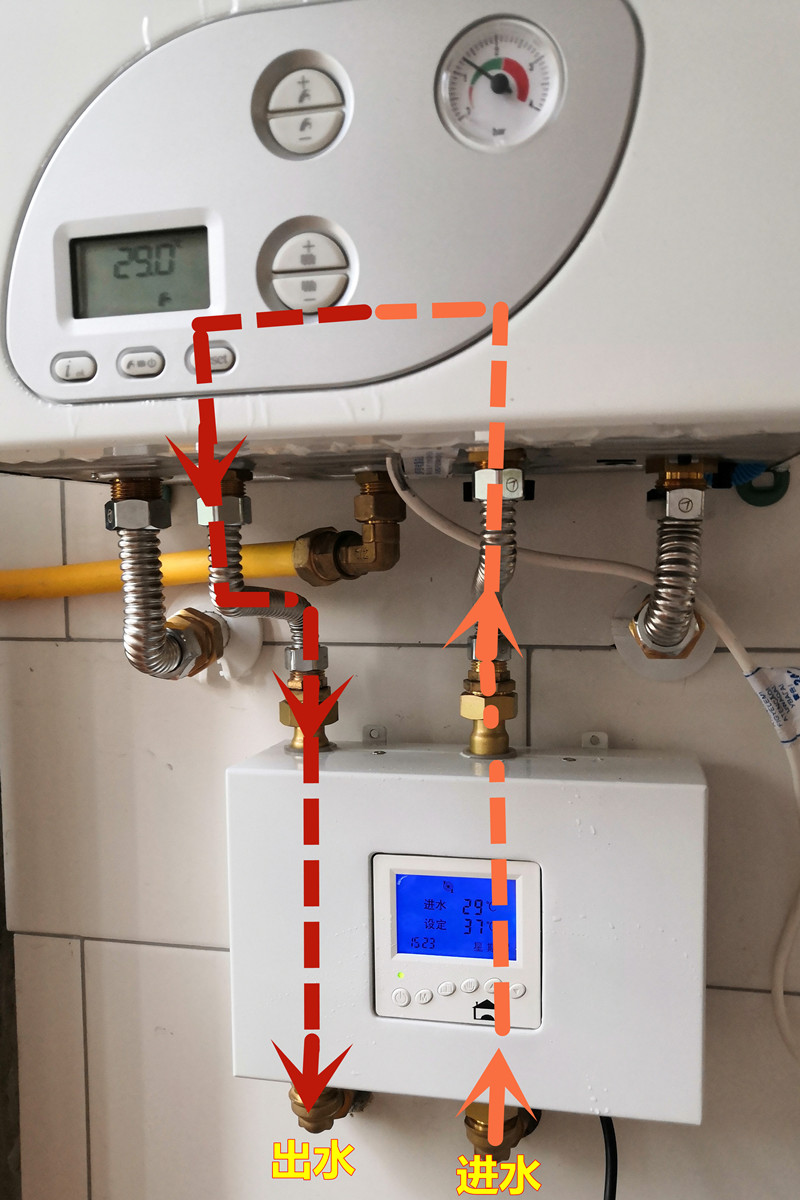 · 安装逻辑:空气能水箱出水管连接自控中心右下进水口,自控中心左下出水口接热水主管道,然后通往用水点,右上口接燃气热水器冷水入口,左上口燃气热水器热水出口。
