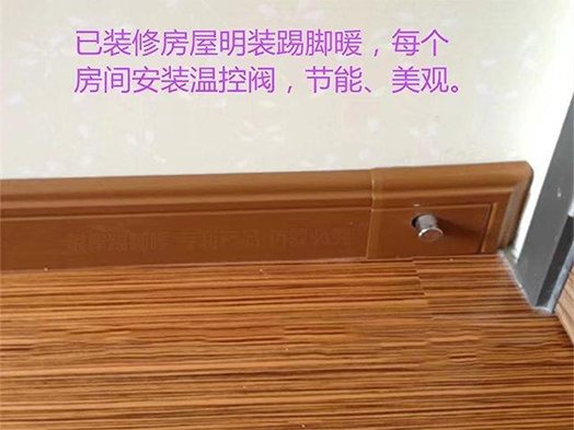 踢脚暖外观看起来就是实木踢脚线,但同时具有供暖功能,由于它采用铝合金材质生产,后面有水道,而且和面板一体成型,供暖时,热水从后面流过,热量就从面板向室内辐射散发,由于从房间四周向中间辐射供暖,升温十分迅速,一般10-20分钟,室内温度就可以达到20多左右,而且从人体的脚部加热,热源一开,人坐在屋内首先脚部就开始感觉暖和,脚暖头凉,十分舒适。