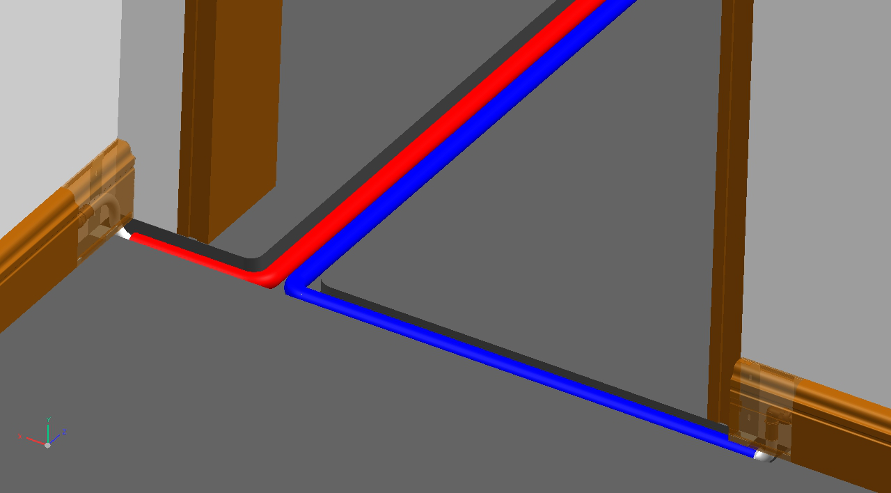 第二种情况是已装修过的房子安装踢脚线暖气片。由于inwarm踢脚线暖气片的厚度设计后面可以放得下2根外径20的供暖主管,因此安装踢脚线暖气片时,供暖管道可从踢脚线暖气片后面走,墙面上看不见管道。一般系统设计采用双管并联同程式,供暖主管沿着整套房子的外墙内侧走,一般不用过室内门,但一般会过一个入户门和客厅或卧室到阳台的一个移门,过这两个门方法一般有四种方式: