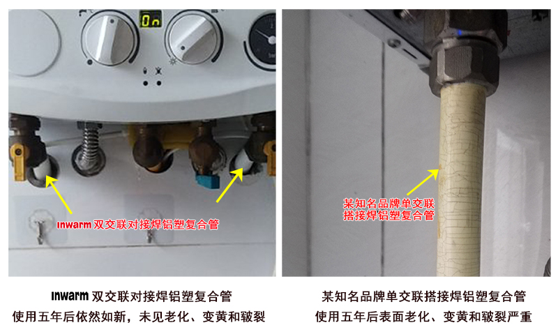 从以上使用五年的对比照片可以看出来,燃气壁挂炉下用inwarm双交联对接焊铝塑复合管作为供暖主管的,使用五年以后,外表面依旧如新,没有任何老化、变黄和皲裂的痕迹,与铜配件连接处没有出现冷胀冷缩渗漏水需要每年维修的现象;而另一家燃气壁挂炉下用国内某知名品牌的单交联搭接焊铝塑管作为供暖主管的,外表面很明显老化变黄,而且皲裂严重,与卡套式铜配件连接处每年供暖开始和结束时都会出现渗漏水现象,都要水暖师傅上门进行维修。两种铝塑管孰好孰坏一目了然。