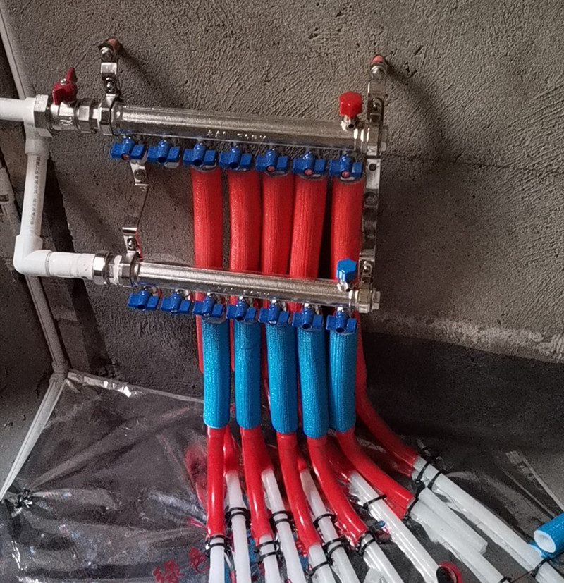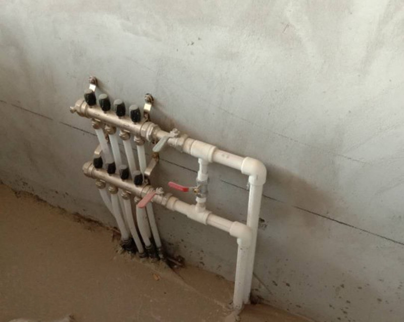 上面这样2张照片供暖主管与分水器连接处占用很大的空间,很不合理。