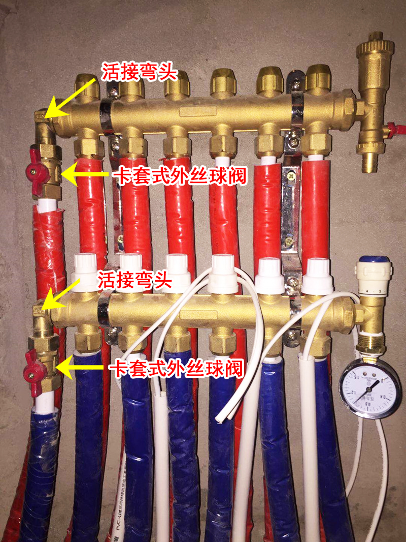 用这个活接弯头,供暖分水器前有5cm空间就能安装主管,而且方便清洗和维修