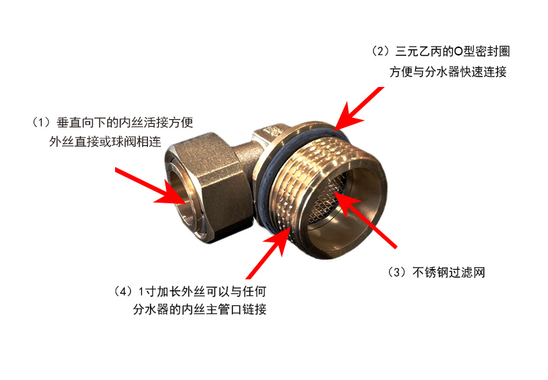 这种活接弯头与分水器连接一头是1寸加长外丝直接,另一头是3/4内丝活接螺母,方便与供暖主管的外丝直接或外丝球阀连接。具体使用方法如下: