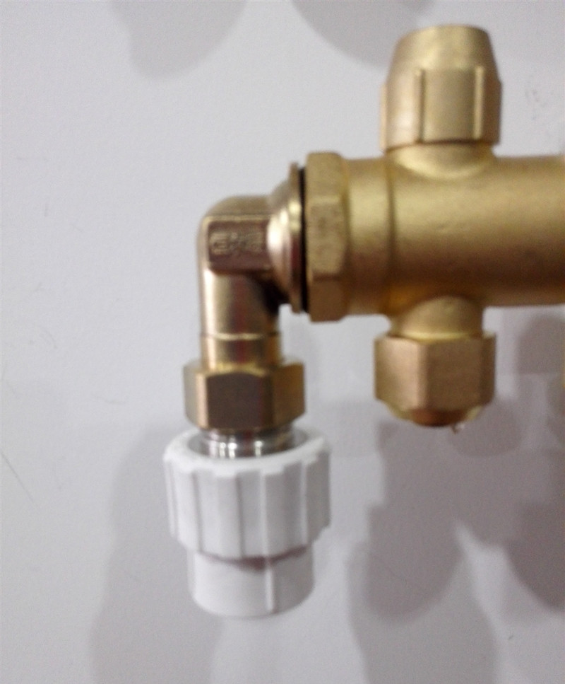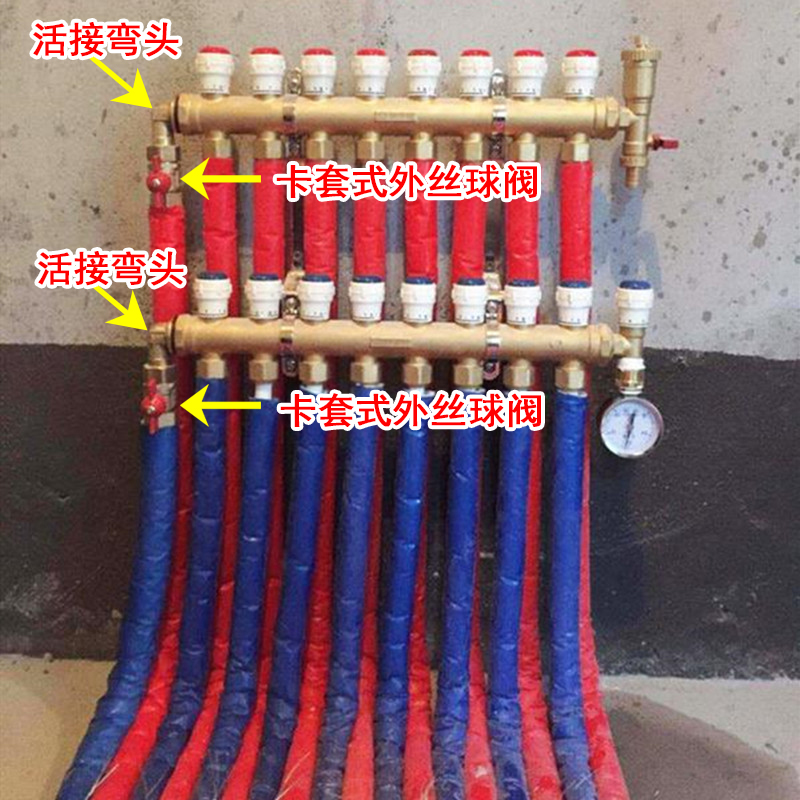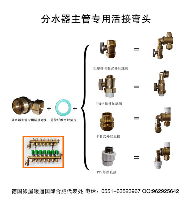 5、活接弯头下端可以接铝塑管卡套式外丝球阀或直接,或者接PPR外丝球阀或直接,无论你主管用什么材料,都可以与分水器轻松连接。