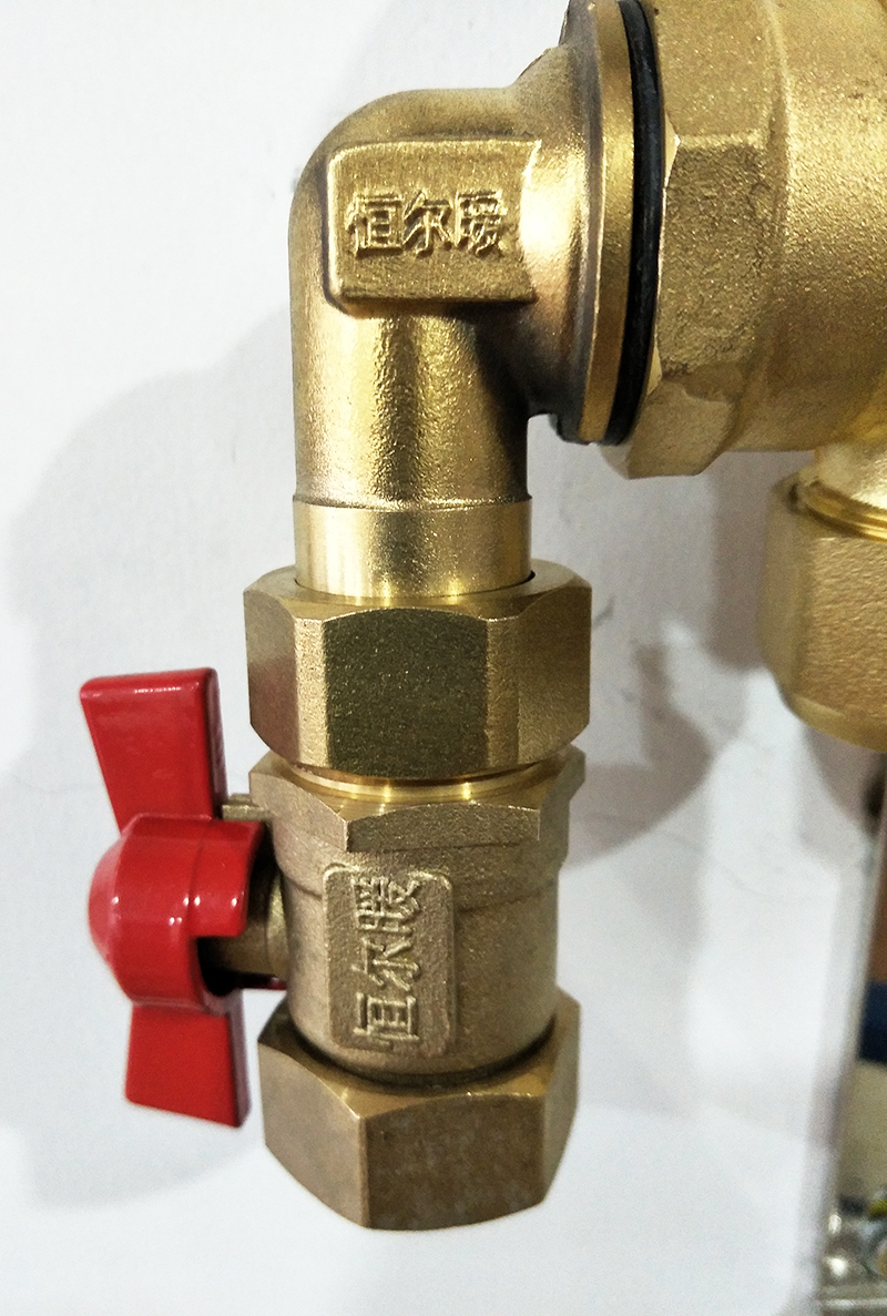 7、活接弯头设计小巧,活接螺母向下与外丝球阀或外丝直接之间相连,不占用空间,即使分水器边上只有有5cm长的空间,就可以装得下,以后检修或冲洗十分方面,即使分水器不动,都可以把活接弯头和球阀拆卸下来;