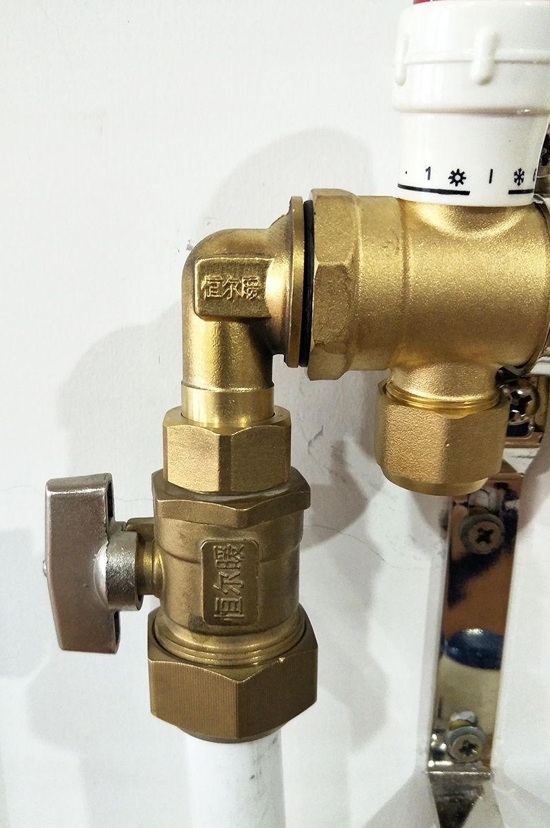 们知道地暖和用章鱼式系统的暖气片或踢脚暖都要用到分水器作为供暖水的分流和集回控制中心,为了美观,分水器一般都放在卫生间洗脸池或厨房的橱柜下,由于这些地方的空间都很有限,因此分水器和供暖主管尽量少占地方最好,有的安装师傅根本不为顾客考虑这些问题,在供暖主管与分水器连接处用直阀,占用很大空间,见下图。