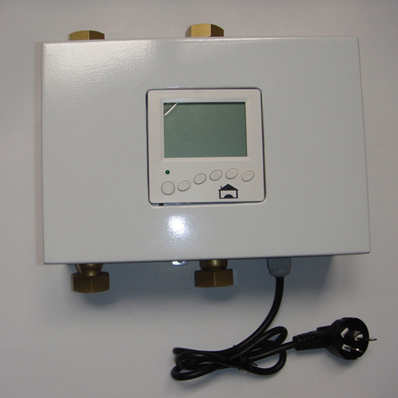 该自控中心由电动三通阀、温度传感器、温度控制器、连接铜管、管件和外壳组成,水温传感器直接插入水中,使测量的温度更精确,温度控制器具有较大的液晶显示屏,可以显示设定温度、实际温度、工作模式、日期和时间等。自控中心具有手动模式和定时自动模式,人工开机默认为手动模式,通过按键“▲”设定增加温度,通过按键“▼”设定降低温度,操作十分简便;定时自动模式,每天可分为四个时间段,每个时间段可设定不同的水温,模式设定后,温控器按照所设定的时间有规律地自动开机和关机,既节能又方便提高生活舒适度,同时又延长自控中心的使用寿命。