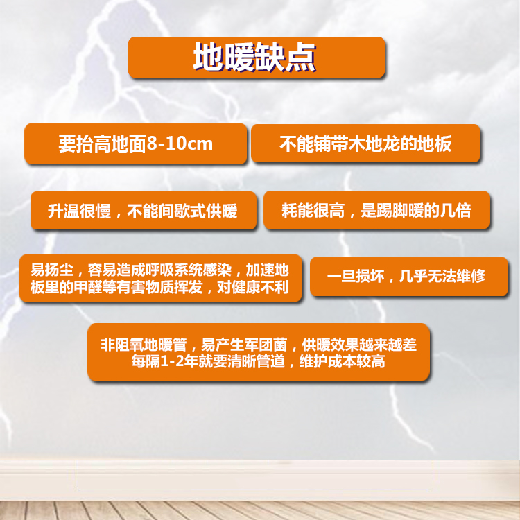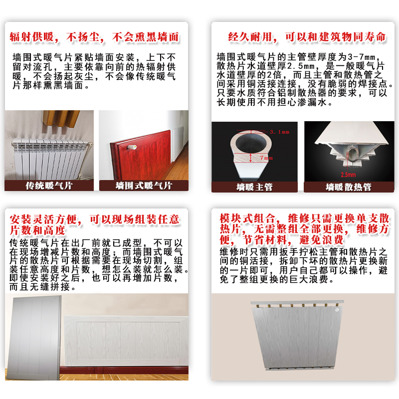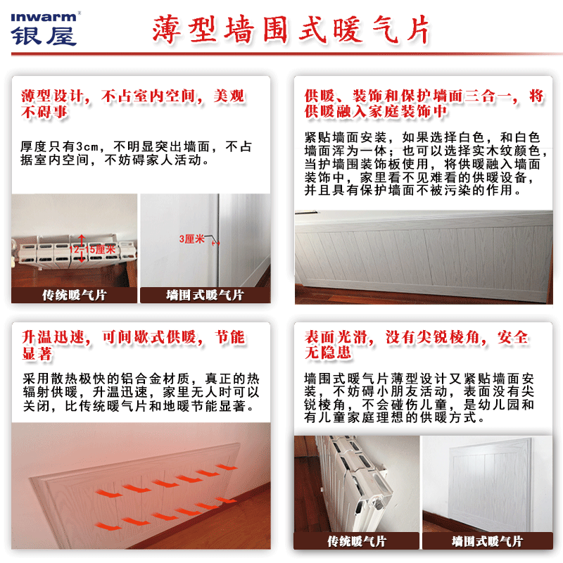 传统暖气片突出墙面较多,占据室内空间,影响家具的摆放;外形不美观,破坏装修的整体效果;对流式供暖,易扬尘熏黑墙面;有尖锐棱角,容易碰伤活泼好动的儿童。
