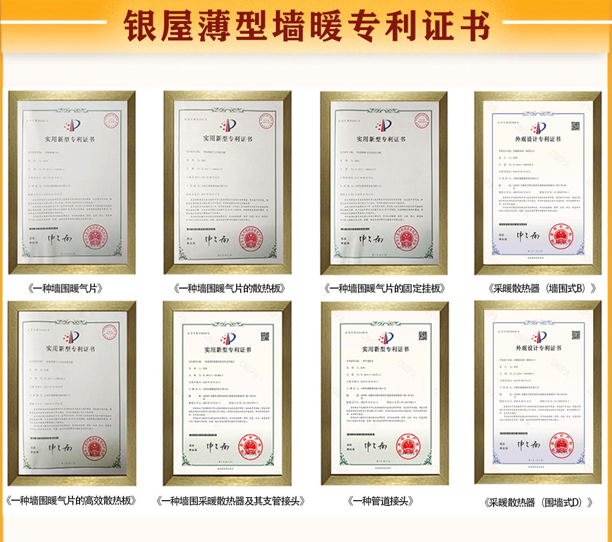 银屋护墙装饰板采暖已荣获国家知识产权局8项专利授权,在世界范围内还没有发现一样的产品。