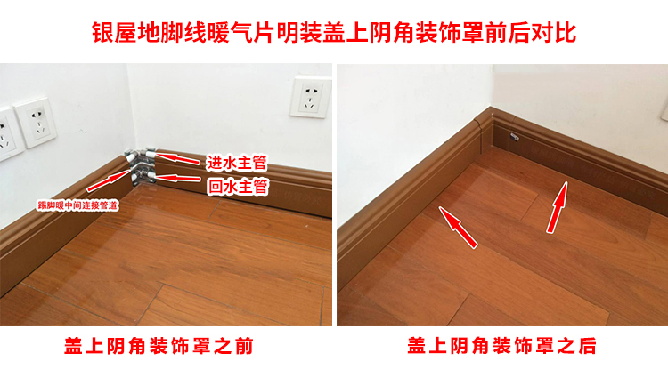 (银屋踢脚板供暖明装供暖系统管道隐藏踢脚板供暖后面盖上阴角装饰罩前后对比图)