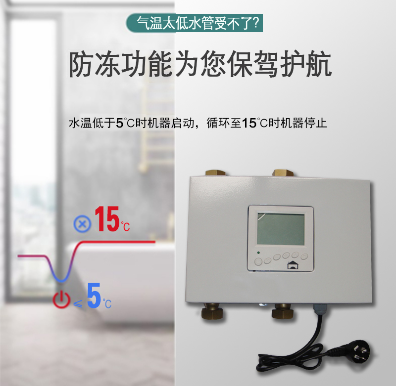 恒尔暖自控中心和循环泵配置的恒尔暖循环泵控制器具有低温防冻功能。当水温低于5℃时,自动开启低温保护,自控中心和循环泵开启工作;直到水温达到15℃后,自控中心和循环泵关闭。备注:要保证此功能起作用,必须确保燃气热水器的电源和燃气接通,即燃气热水器可以正常工作。