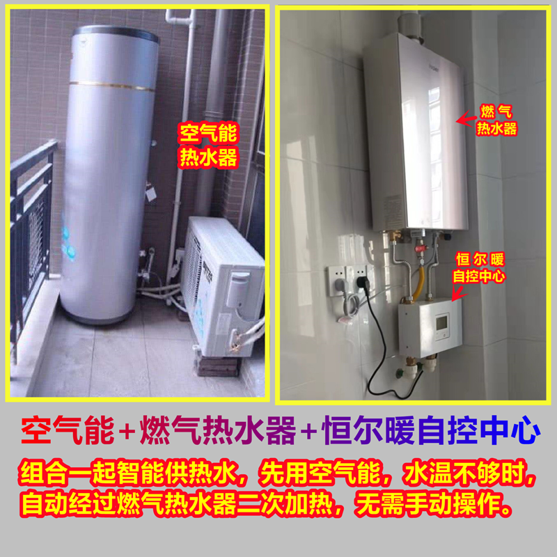 空气能和燃气热水器利用恒尔暖自控中心组合一起供热水,先用空气能出水,水温不够时,自动经过燃气热水器进行二次,而且具有即开即有热水的零冷水功能,并具有低温防冻功能,可定时定温智能开关机,全程智能控制,无需人工操作。