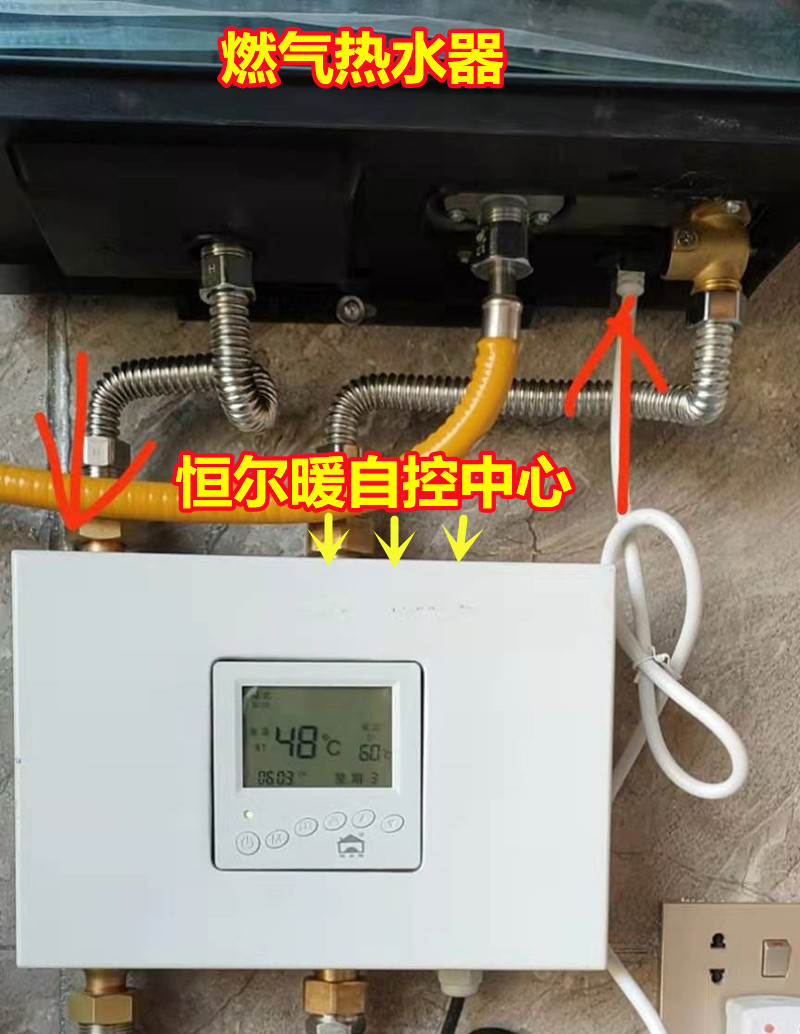 只要将这个自控中心安装在燃气热水器边上,从空气能水箱出水口接出管道,与自控中心右下水口连接,自控中心的左下水口与家里的热水主管连接,自控中心右上水口与燃气热水器冷水入水口连接,自控中心左上水口与燃气热水器热水出水口连接。