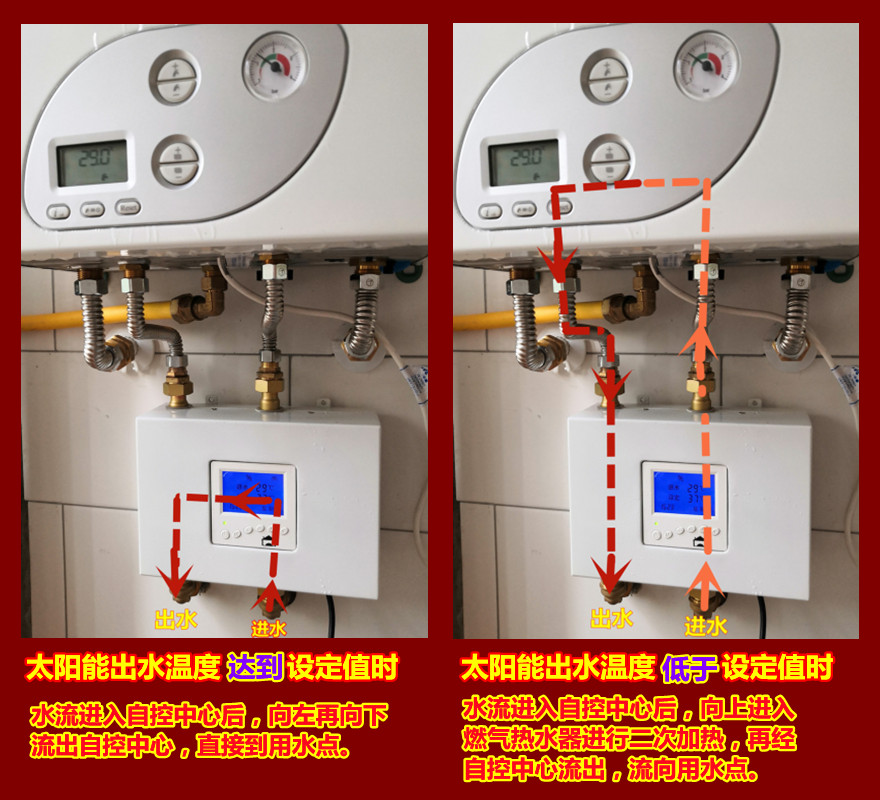 其工作原理巧妙而高效。以太阳能热水器与燃气热水器的组合为例,当太阳能热水器的出水温度达到在自控中心设定的水温时,水流便会从自控中心的右下口进入,径直从左下口流出,直奔用水点,让我们即刻享受舒适热水。一旦遇到阴天、冬天等太阳能水温不足的情况,水流进入自控中心后,会自动从右上口流经燃气热水器进行二次加热,随后经自控中心流出,确保每一滴水都温暖适宜。这种智能切换过程无需人工干预,真正实现了热水供应的智能化与自动化。