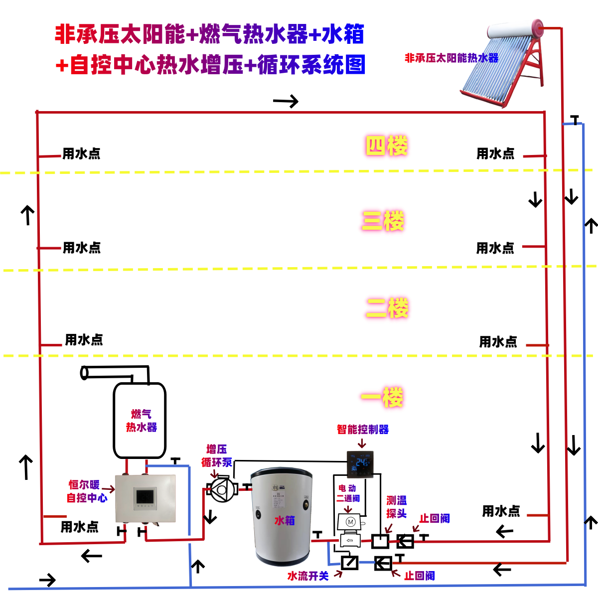 增压热水主管安装自吸变频增压泵(带缺水保护),多龙头同时开不降压,顶楼花洒也能喷出水柱特别主热水器是非承压太阳能时,必须安装